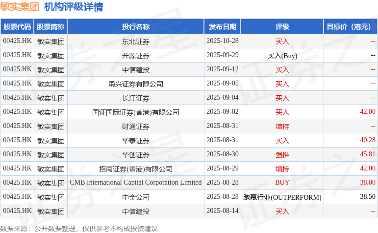 投行对该股的评级以买入为主,近90天内共有7家投行给出买入评级,近90天的目标均价为41.1港元。东北证券最新一份研报给予敏实集团买入评级。
