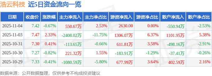 证券之星消息,截至2025年11月4日收盘,浩云科技(300448)报收于7.42元,下跌0.67%,换手率6.34%,成交量29.46万手,成交额2.18亿元。
