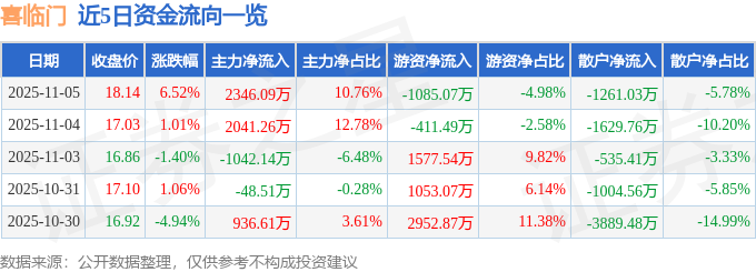 11月5日的资金流向数据方面,主力资金净流入2346.09万元,占总成交额10.76%,游资资金净流出1085.07万元,占总成交额4.98%,散户资金净流出1261.03万元,占总成交额5.78%。