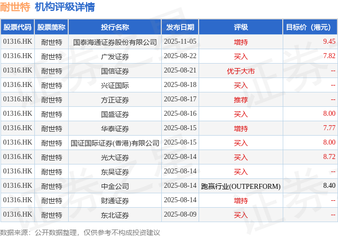 投行对该股的评级以买入为主,近90天内共有7家投行给出买入评级,近90天的目标均价为8.31港元。国泰海通证券股份有限公司最新一份研报给予耐世特增持评级,目标价9.45港元。