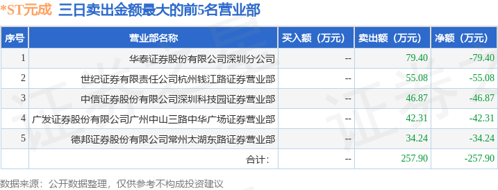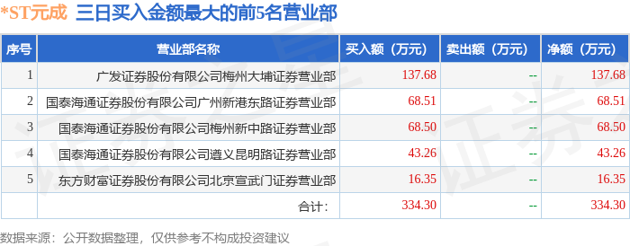 证券之星消息,沪深交易所2025年11月5日公布的交易公开信息显示,*ST元成(603388)因ST、*ST证券连续三个交易日内收盘价格跌幅偏离值累计达到12%的证券登上龙虎榜。此次是近5个交易日内第2次上榜。