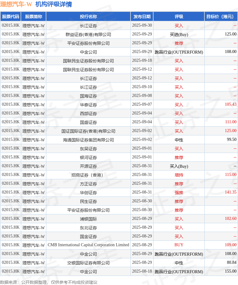 投行对该股的评级以买入为主,近90天内共有14家投行给出买入评级,近90天的目标均价为114.29港元。长江证券最新一份研报给予理想汽车-W买入评级。