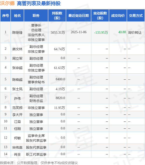 沃尔德近半年内的董监高及核心技术人员增减持详情如下: