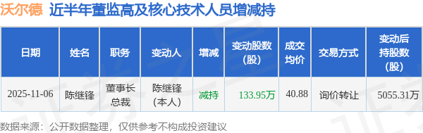 证券之星消息,根据11月6日市场公开信息、上市公司公告及交易所披露数据整理,沃尔德(688028)最新董监高及相关人员股份变动情况:2025年11月6日公司董事长,总裁陈继锋共减持公司股份133.95万股,占公司总股本为0.8874%。变动期间公司股价上涨11.22%,11月6日当日收盘报56.39元。