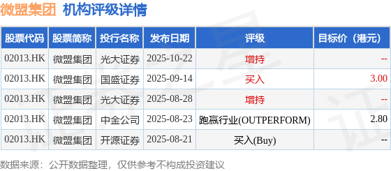 截至2025年11月6日收盘,微盟集团(02013.HK)报收于2.22港元,上涨1.37%,成交量3238.81万股,成交额7134.16万港元。投行对该股的评级以增持为主,近90天内共有2家投行给出增持评级,近90天的目标均价为2.9港元。光大证券最新一份研报给予微盟集团增持评级。