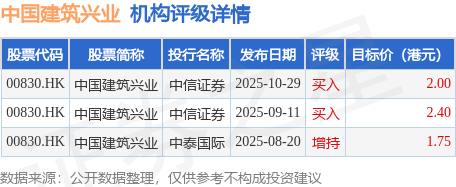 截至2025年11月6日收盘,中国建筑兴业(00830.HK)报收于1.17港元,上涨2.63%,成交量19.0万股,成交额21.84万港元。投行对该股的评级以买入为主,近90天内共有2家投行给出买入评级,近90天的目标均价为2.05港元。中信证券最新一份研报给予中国建筑兴业买入评级,目标价2港元。