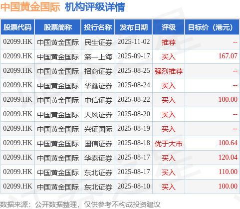 投行对该股的评级以买入为主,近90天内共有8家投行给出买入评级,近90天的目标均价为116.29港元。民生证券最新一份研报给予中国黄金国际推荐评级。