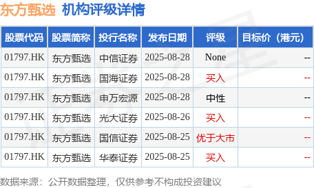 投行对该股的评级以买入为主,近90天内共有3家投行给出买入评级。中信证券最新一份研报给予东方甄选None评级。