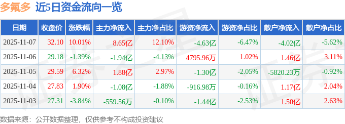 证券之星消息,多氟多11月7日涨停收盘,收盘价32.1元。该股于10点44分涨停,9次打开涨停,截止收盘封单资金为978.47万元,占其流通市值0.03%。