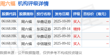投行对该股的评级以买入为主,近90天内共有3家投行给出买入评级。华鑫证券最新一份研报给予周六福买入评级。