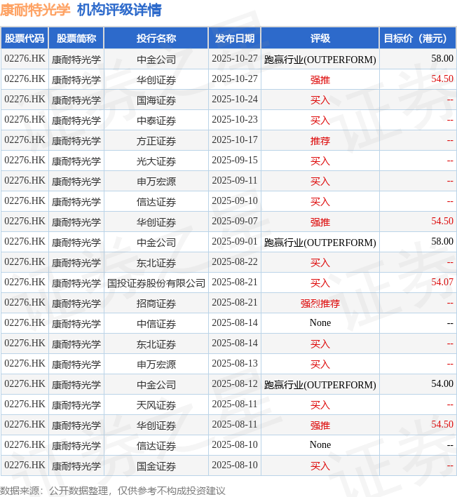 投行对该股的评级以买入为主,近90天内共有11家投行给出买入评级,近90天的目标均价为55.37港元。中金公司最新一份研报给予康耐特光学跑赢行业(OUTPERFORM)评级,目标价58港元。