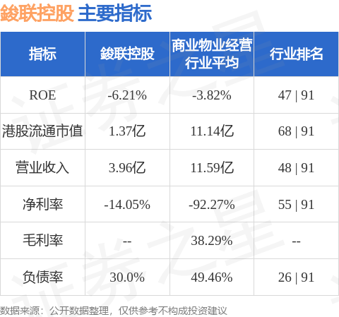 鋑联控股港股市值1.37亿港元,在商业物业经营行业中排名第68。主要指标见下表: