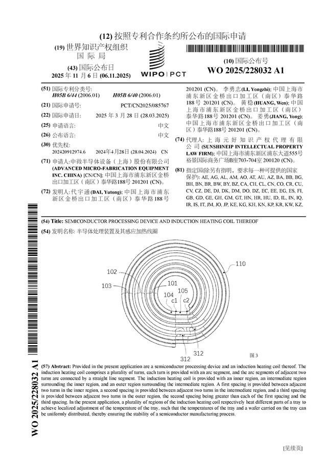 证券之星消息,根据企查查数据显示中微公司(688012)公布了一项国际专利申请,专利名为“半导体处理装置及其感应加热线圈”,专利申请号为PCT/CN2025/085767,国际公布日为2025年11月6日。
