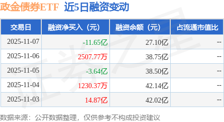 证券之星消息,11月7日,政金债券ETF(511520)融资买入1.29亿元,融资偿还12.94亿元,融资净卖出11.65亿元,融资余额27.1亿元,近20个交易日中有11个交易日出现融资净买入。
