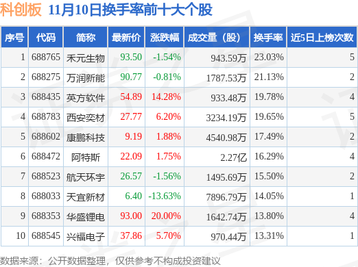 当日科创板换手率前10大个股中6只个股收涨,平均涨幅8.3%,其中禾元生物(688765)以换手率23.03%排第一,8只个股近5个交易日中多次上榜。