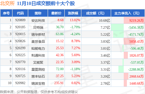 当日北交所成交额前10大个股中7只个股收涨,平均涨幅6.27%,其中安达科技(920809)以成交额10.68亿元排第一。从主力资金流入看,成交额前10大个股中有5只个股呈现主力资金净流入。