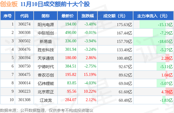 当日创业板成交额前10大个股中4只个股收涨,平均涨幅7.6%,其中阳光电源(300274)以成交额175.63亿元排第一。从主力资金流入看,成交额前10大个股中有3只个股呈现主力资金净流入。