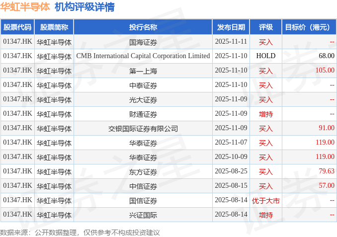 投行对该股的评级以买入为主,近90天内共有9家投行给出买入评级,近90天的目标均价为91.23港元。国海证券最新一份研报给予华虹半导体买入评级。
