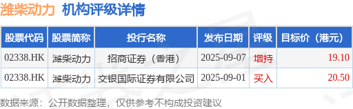 投行对该股的评级以增持为主,近90天内共有1家投行给出增持评级,近90天的目标均价为19.8港元。招商证券(香港)最新一份研报给予潍柴动力增持评级,目标价19.1港元。