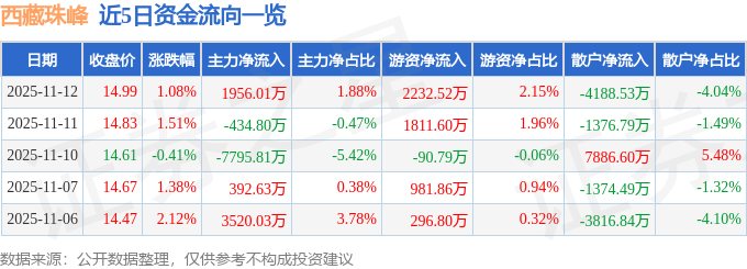 11月12日的资金流向数据方面,主力资金净流入1956.01万元,占总成交额1.88%,游资资金净流入2232.52万元,占总成交额2.15%,散户资金净流出4188.53万元,占总成交额4.04%。