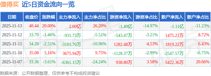 证券之星消息,值得买11月13日涨停收盘,收盘价40.44元。该股于14点49分涨停,未打开涨停,截止收盘封单资金为2.54亿元,占其流通市值5.14%。