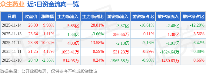 证券之星消息,众生药业11月14日涨停收盘,收盘价26.0元。该股于9点32分涨停,1次打开涨停,截止收盘封单资金为2.95亿元,占其流通市值1.49%。