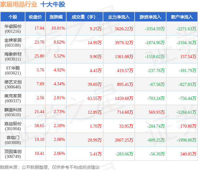 个股表现方面,家居用品行业当日领涨股为华瓷股份(001216),该股当日报收17.04,上涨10.01%,成交量9.25万,主力资金净流入5626.22万元。金牌家居(603180)以上涨8.62%紧随其后,该股当日成交量14.99万,主力资金净流入3979.32万元。除此之外,海象新材(003011)、ST华鹏(603021)、德艺文创(300640)均进入当日牛股之列。具体个股列表见下表: