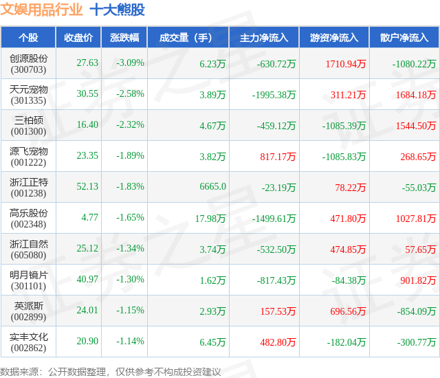 个股表现方面,文娱用品行业当日领跌股为创源股份(300703),该股当日报收27.63,下跌3.09%,成交量6.23万,主力资金净流出630.72万元。天元宠物(301335)以下跌2.58%紧随其后,该股当日成交量3.89万,主力资金净流出1995.38万元。除此之外,三柏硕(001300)、源飞宠物(001222)、浙江正特(001238)均进入当日熊股之列。具体个股列表见下表: