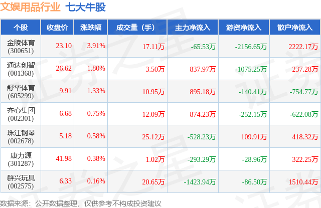 个股表现方面,文娱用品行业当日领涨股为金陵体育(300651),该股当日报收23.1,上涨3.91%,成交量17.11万,主力资金净流出65.53万元。通达创智(001368)以上涨1.8%紧随其后,该股当日成交量3.5万,主力资金净流入837.97万元。除此之外,舒华体育(605299)、齐心集团(002301)、珠江钢琴(002678)均进入当日牛股之列。具体个股列表见下表: