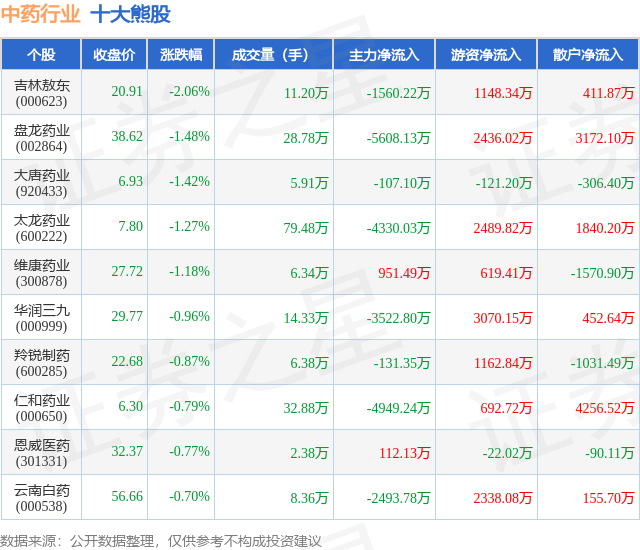 个股表现方面,中药行业当日领跌股为吉林敖东(000623),该股当日报收20.91,下跌2.06%,成交量11.2万,主力资金净流出1560.22万元。盘龙药业(002864)以下跌1.48%紧随其后,该股当日成交量28.78万,主力资金净流出5608.13万元。除此之外,大唐药业(920433)、太龙药业(600222)、维康药业(300878)均进入当日熊股之列。具体个股列表见下表: