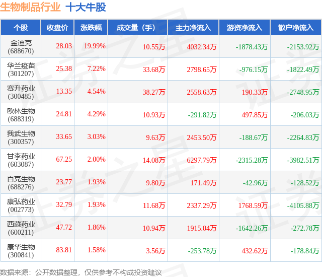 个股表现方面,生物制品行业当日领涨股为金迪克(688670),该股当日报收28.03,上涨19.99%,成交量10.55万,主力资金净流入4032.34万元。华兰疫苗(301207)以上涨7.22%紧随其后,该股当日成交量33.68万,主力资金净流入2798.65万元。除此之外,赛升药业(300485)、欧林生物(688319)、我武生物(300357)均进入当日牛股之列。具体个股列表见下表: