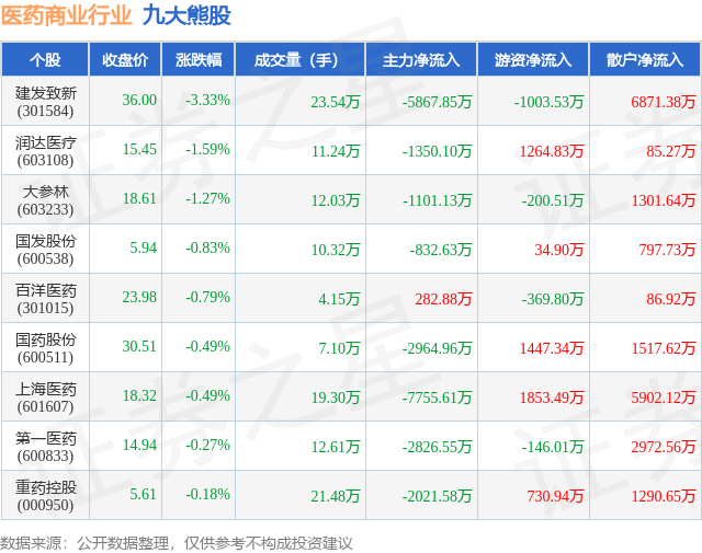 个股表现方面,医药商业行业当日领跌股为建发致新(301584),该股当日报收36.0,下跌3.33%,成交量23.54万,主力资金净流出5867.85万元。润达医疗(603108)以下跌1.59%紧随其后,该股当日成交量11.24万,主力资金净流出1350.1万元。除此之外,大参林(603233)、国发股份(600538)、百洋医药(301015)均进入当日熊股之列。具体个股列表见下表: