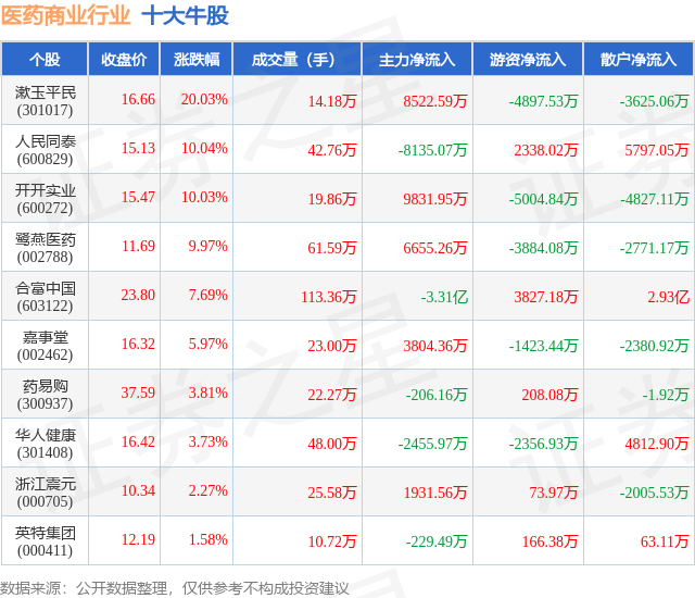 个股表现方面,医药商业行业当日领涨股为漱玉平民(301017),该股当日报收16.66,上涨20.03%,成交量14.18万,主力资金净流入8522.59万元。人民同泰(600829)以上涨10.04%紧随其后,该股当日成交量42.76万,主力资金净流出8135.07万元。除此之外,开开实业(600272)、鹭燕医药(002788)、合富中国(603122)均进入当日牛股之列。具体个股列表见下表: