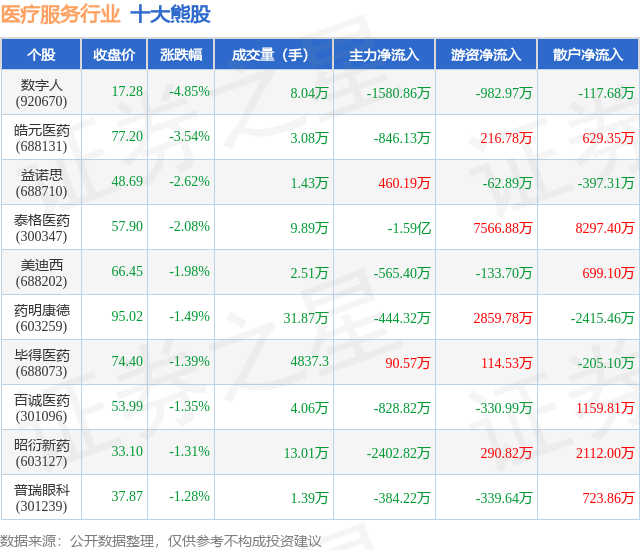 个股表现方面,医疗服务行业当日领跌股为数字人(920670),该股当日报收17.28,下跌4.85%,成交量8.04万,主力资金净流出1580.86万元。皓元医药(688131)以下跌3.54%紧随其后,该股当日成交量3.08万,主力资金净流出846.13万元。除此之外,益诺思(688710)、泰格医药(300347)、美迪西(688202)均进入当日熊股之列。具体个股列表见下表: