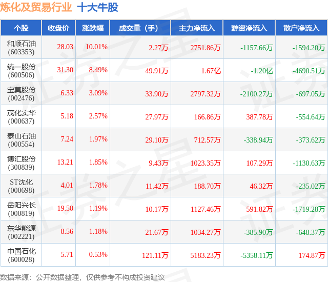 个股表现方面,炼化及贸易行业当日领涨股为和顺石油(603353),该股当日报收28.03,上涨10.01%,成交量2.27万,主力资金净流入2751.86万元。统一股份(600506)以上涨8.49%紧随其后,该股当日成交量49.91万,主力资金净流入1.67亿元。除此之外,宝莫股份(002476)、茂化实华(000637)、泰山石油(000554)均进入当日牛股之列。具体个股列表见下表: