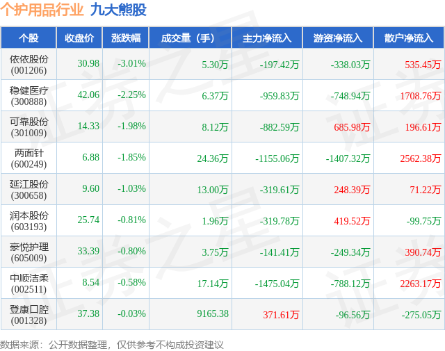 个股表现方面,个护用品行业当日领跌股为依依股份(001206),该股当日报收30.98,下跌3.01%,成交量5.3万,主力资金净流出197.42万元。稳健医疗(300888)以下跌2.25%紧随其后,该股当日成交量6.37万,主力资金净流出959.83万元。除此之外,可靠股份(301009)、两面针(600249)、延江股份(300658)均进入当日熊股之列。具体个股列表见下表: