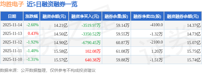 均胜电子融资融券信息显示,融资方面,当日融资买入7014.67万元,融资偿还1.05亿元,融资净偿还3519.97万元。融券方面,融券卖出4400.0股,融券偿还8500.0股,融券余量59.14万股,融券余额1597.37万元。融资融券余额14.37亿元。
