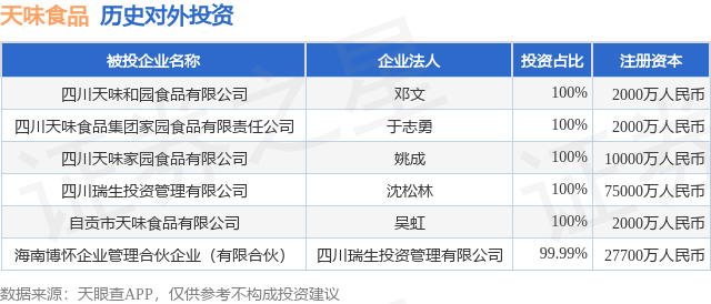 证券之星消息,根据天眼查APP显示,天味食品(603317.SH)新增一起对外投资事件,被投资公司为四川天味和园食品有限公司,法定代表人邓文,投资占比为100%。该公司从事食品制造业,注册资本为2000万人民币。目前,天味食品共存在对外投资6项,详见下表: