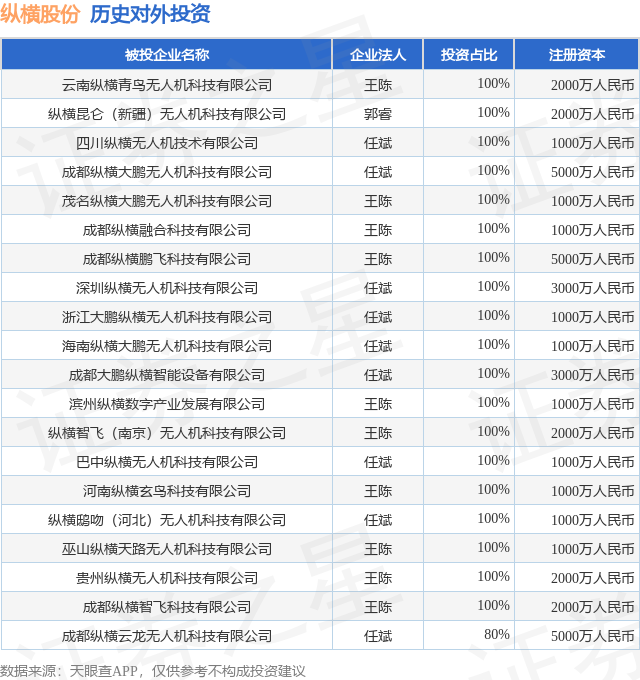 证券之星消息,根据天眼查APP显示,纵横股份(688070.SH)新增一起对外投资事件,被投资公司为云南纵横青鸟无人机科技有限公司,法定代表人王陈,投资占比为100%。该公司从事科技推广和应用服务业,注册资本为2000万人民币。目前,纵横股份共存在对外投资34项,投资占比前20的项目见下表: