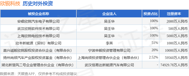 证券之星消息,根据天眼查APP显示,欣锐科技(300745.SZ)新增一起对外投资事件,被投资公司为安徽欣锐汽车电子有限公司,法定代表人吴壬华,投资占比为100%。该公司从事汽车制造业,注册资本为2000万人民币。目前,欣锐科技共存在对外投资7项,详见下表: