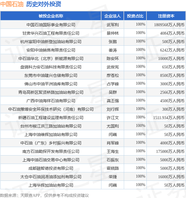 证券之星消息,根据天眼查APP显示,中国石油(601857.SH)新增一起对外投资事件,被投资公司为毕节金海湖新区石油销售有限公司,法定代表人詹丹,投资占比为51%。该公司从事零售业,注册资本为2700万人民币。目前,中国石油共存在对外投资1070项,投资占比前20的项目见下表: