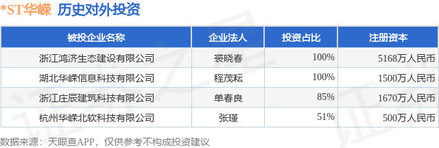 证券之星消息,根据天眼查APP显示,*ST华嵘(600421.SH)新增一起对外投资事件,被投资公司为浙江鸿济生态建设有限公司,法定代表人裘晓春,投资占比为100%。该公司从事土木工程建筑业,注册资本为5168万人民币。目前,*ST华嵘共存在对外投资4项,详见下表: