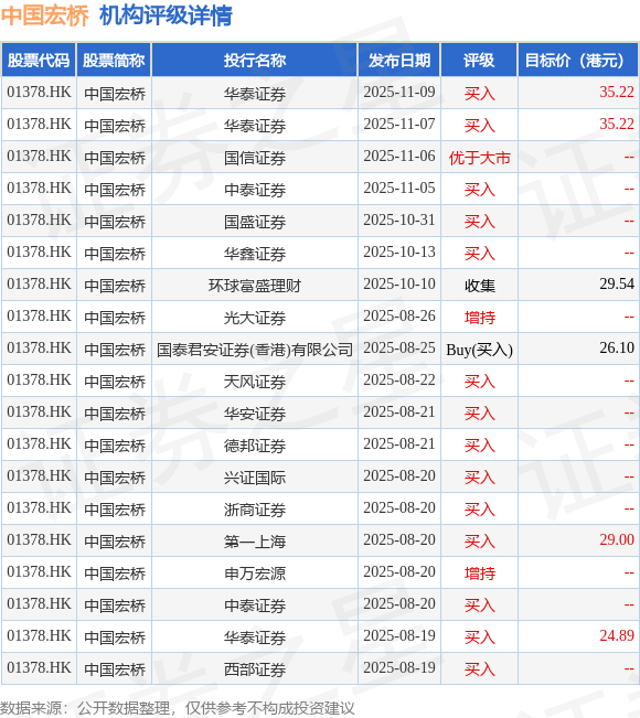 投行对该股的评级以买入为主,近90天内共有14家投行给出买入评级,近90天的目标均价为29.99港元。华泰证券最新一份研报给予中国宏桥买入评级,目标价35.22港元。