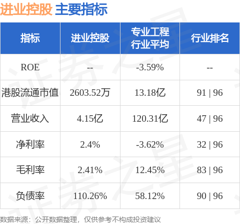 进业控股港股市值2603.52万港元,在专业工程行业中排名第91。主要指标见下表: