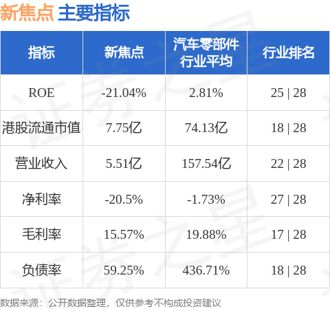 新焦点港股市值7.75亿港元,在汽车零部件行业中排名第18。主要指标见下表: