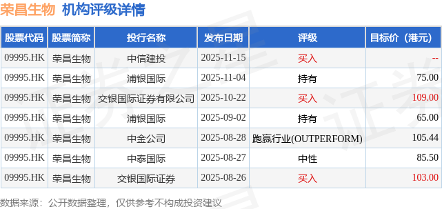 投行对该股的评级以买入为主,近90天内共有3家投行给出买入评级,近90天的目标均价为90.49港元。中信建投最新一份研报给予荣昌生物买入评级。