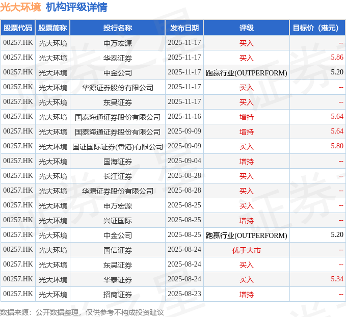 投行对该股的评级以买入为主,近90天内共有10家投行给出买入评级,近90天的目标均价为5.53港元。申万宏源最新一份研报给予光大环境买入评级。
