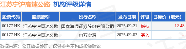截至2025年11月18日收盘,江苏宁沪高速公路(00177.HK)报收于9.89港元,下跌1.1%,成交量575.42万股,成交额5712.86万港元。投行对该股的评级以增持为主,近90天内共有1家投行给出增持评级,近90天的目标均价为12.48港元。国泰海通证券股份有限公司最新一份研报给予江苏宁沪高速公路增持评级,目标价12.48港元。