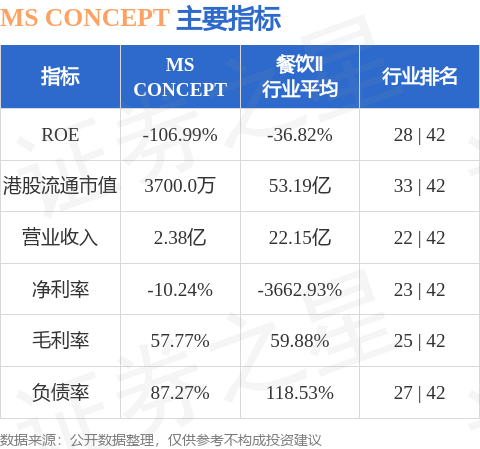 MS CONCEPT港股市值3700万港元,在餐饮Ⅱ行业中排名第33。主要指标见下表: