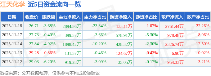 证券之星消息,截至2025年11月18日收盘,江天化学(300927)报收于26.71元,下跌3.68%,换手率3.25%,成交量4.58万手,成交额1.24亿元。